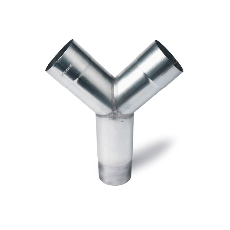 Het Y-stuk heeft twee aansluitingen onder een hoek van 45 graden, beiden voorzien van een mof. De onderzijde is verjongd